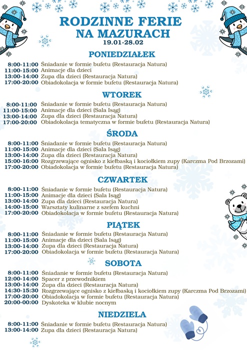 Ferie zimowe w Masuria Hotel & SPA upłyną pod znakiem aktywności i dobrej zabawy. Dla dzieci przygotowaliśmy kreatywne warsztaty plastyczne, zajęcia kulinarne pod okiem zdolnego Szefa Kuchni, wyzwania terenowe, podchody oraz animacje na świeżym powietrzu. Nie zabraknie także rodzinnych rywalizacji w formie turniejów i quizów, a wyprawa do lasu z przewodnikiem pozwoli bliżej poznać zimową przyrodę regionu. W hotelu czekają na Was dodatkowe udogodnienia: pokój zabaw dla najmłodszych, bilard, kręgle oraz piłkarzyki. Dorośli mogą spędzić wieczory na sobotnich imprezach w klubie nocnym czy skorzystać z oferty naszego Mazurskiego SPA, w który oferujemy błogie chwile relaksu i odprężenia.